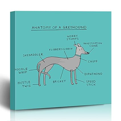 Measurements approx 29 by 195 inches large laminated anatomy of a greyhound. This funny faux anatomy chart of a greyhound includes ear positions. According to merriam webster a greyhound is any of a breed of tall slender graceful smooth coated dogs characterized by swiftness and keen sight as well as any of several related dogs such as the italian greyhound.